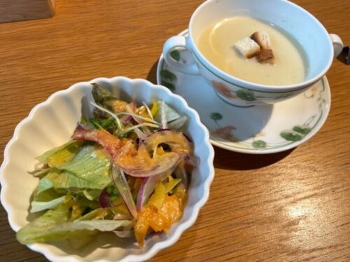ランチセットのスープというと、あまり具材も入っていないシンプルなコンソメスープを提供されているお店も多いですが、さつまいものポタージュを出していただけたことに驚きました!
