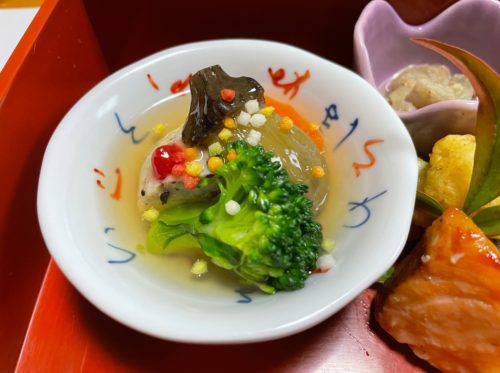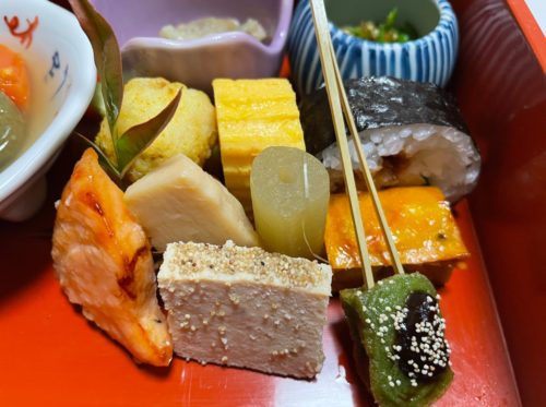 そして次にやってきたのが、朱塗りの箱に色とりどりのお料理が美しい玉手箱!