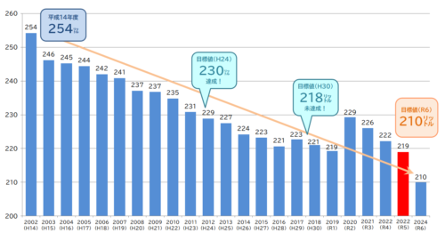 ちなみに目標値「210リットル」は九州の主な都市の平成28年度平均値だそうで、