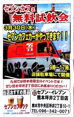 【無料試飲会】日本に一台のセブンカフェカーが3月30日熊本にやってくる!