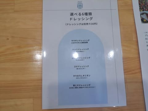 さらにドレッシング(別売り30円)も【サウザンドドレッシング、ナッツドレッシング、シーザードレッシング、ゴマドレッシング、すりおろしオニオン、青じそドレッシング】の6種類あり、サラダの味をその日の気分で変えることができますよ。