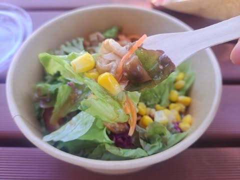 キノコのコリコリ感とシャキシャキした葉物野菜、キュウリやコーンの歯ごたえもあってとても食べ応えがあります。