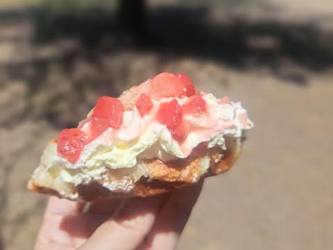 今回は「いちごクリーム」にしたのですが他のクロッフルもバラエティ豊かで、自分で食べるだけでなく近くの方にお土産でも嬉しいラインナップです。
