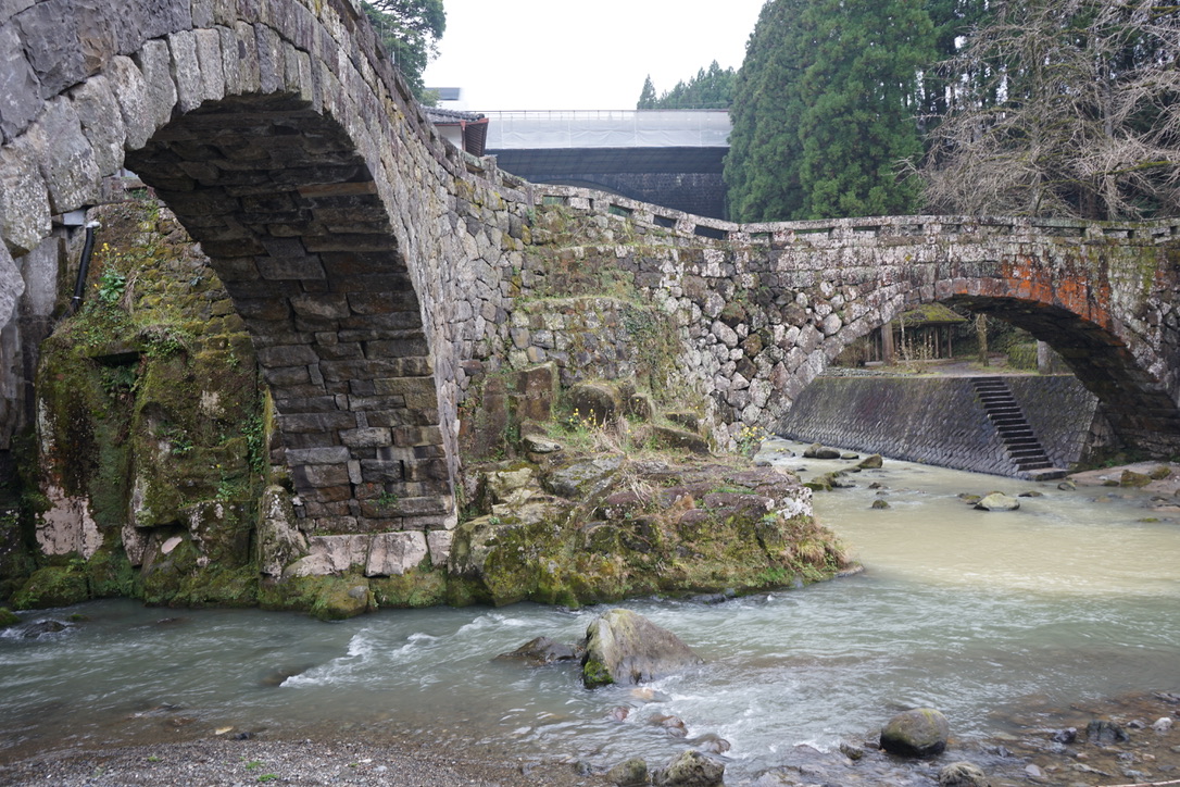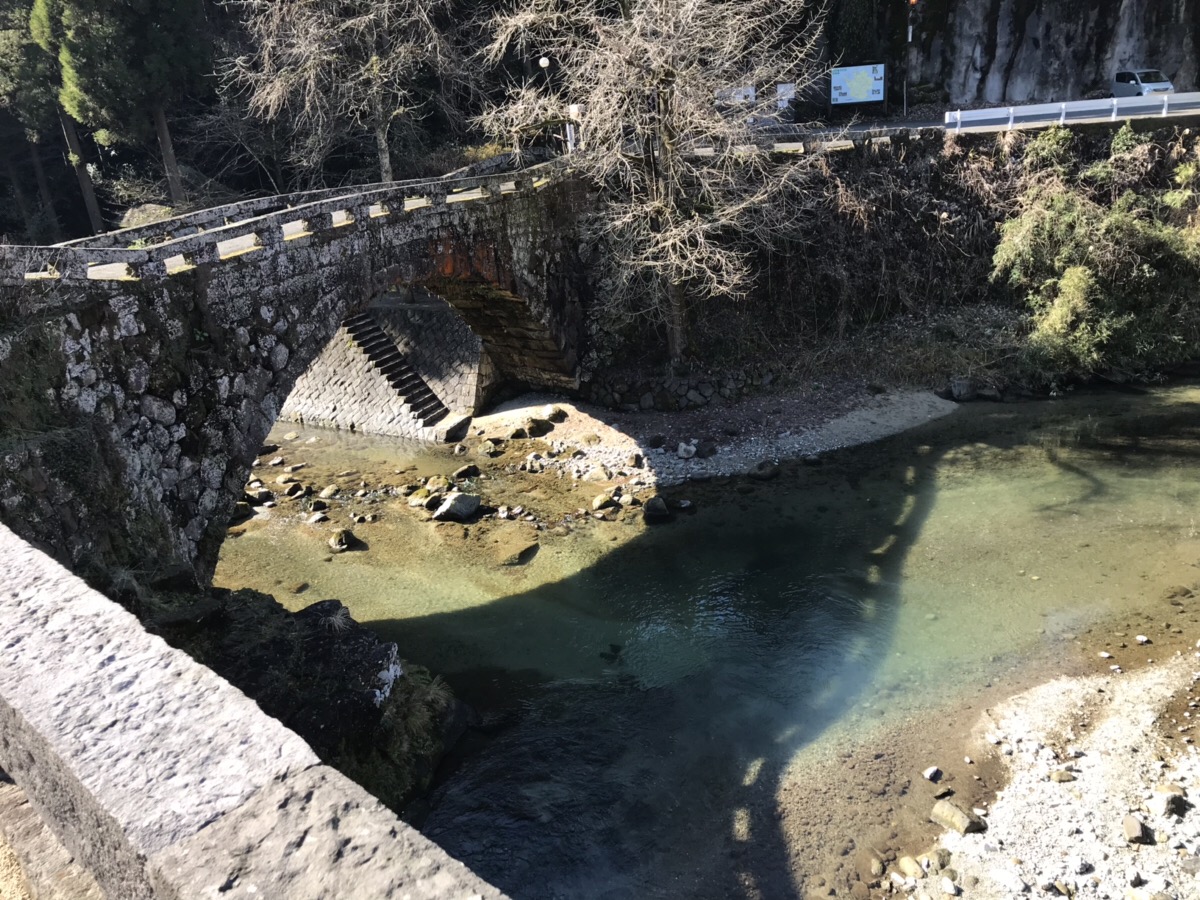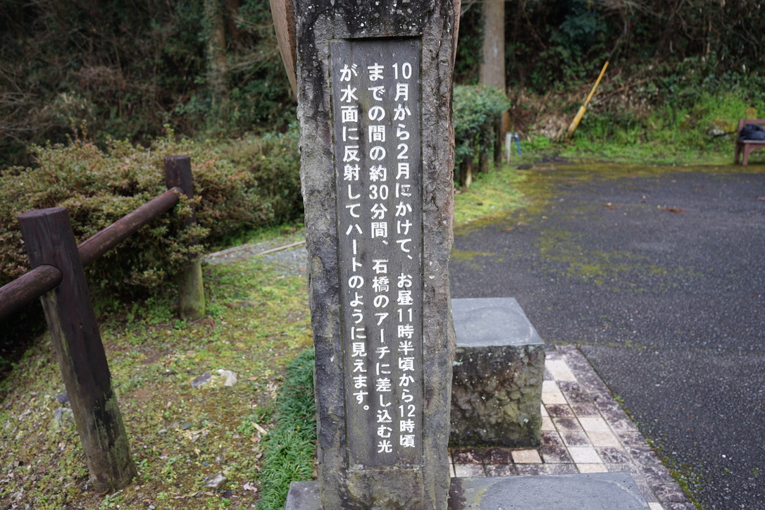ハートの形が見られることで有名な橋ですが、実は2つの石橋が繋がっているんです。写真奥の二俣渡(ふたまたわたし)・写真手前の二俣福良渡(ふたまたふくらわたし)は、川の合流点に直角に交わる全国でも珍しい兄弟橋なんです。二俣渡が文政12年(1829年)、二俣福良渡がその翌年に造られました。