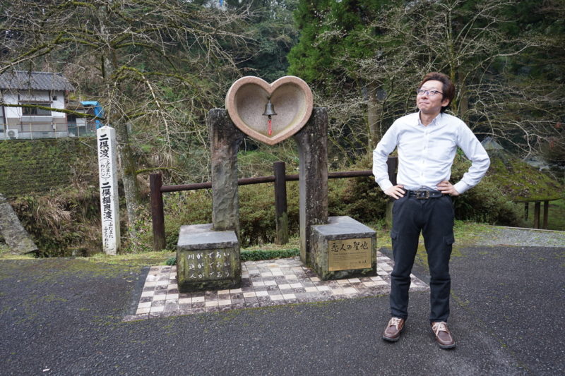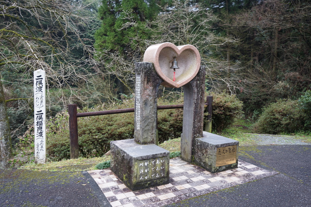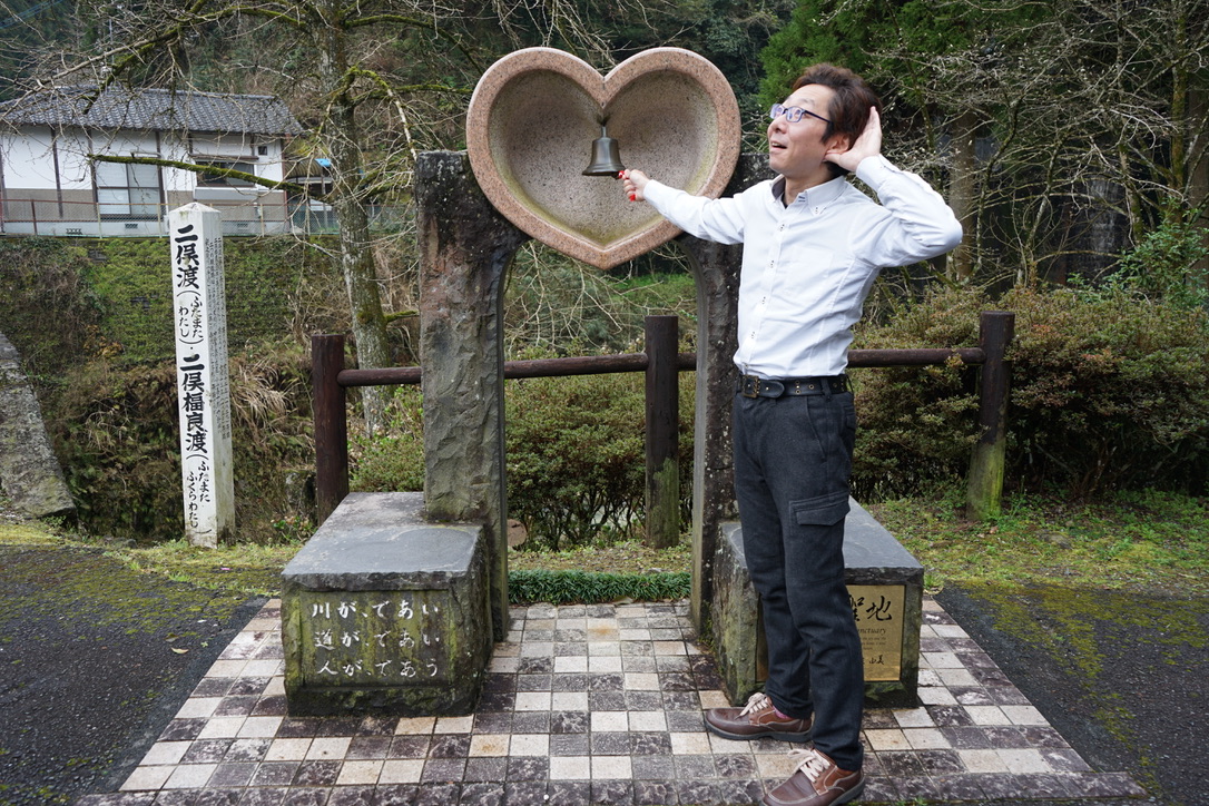 下益城郡美里町にある、恋人の聖地「二俣橋」にやってきました。ここには1つ目の鐘「恋人の鐘」があります。