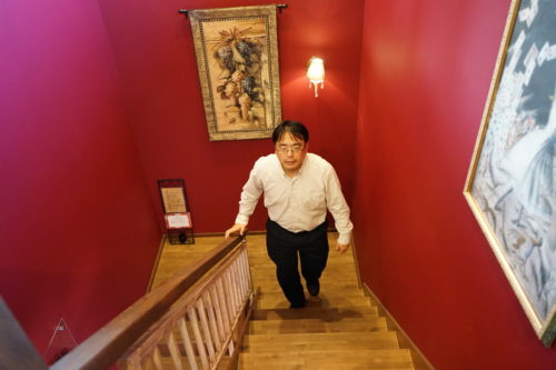 19世紀の洋館のみたいな雰囲気。階段の壁の絵や装飾も凝っていて上野Pはなぜか緊張してキョロキョロしています。