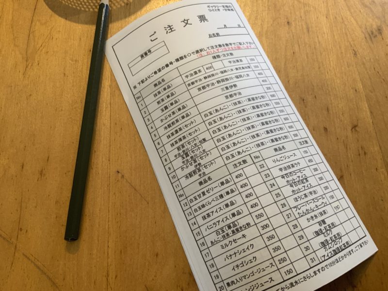 注文は手書きで。白玉300円とかお手軽価格過ぎませんかね。お茶とセットにしても500円~