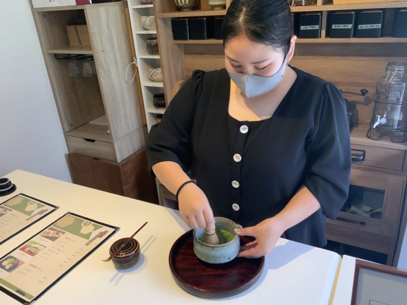 お抹茶はお店の方がされている裏千家の点て方だそうですが、お茶を楽しんでもらうためのお店なので、作法は気にせず気軽に飲んでみて下さい、とのことでした。