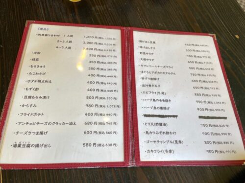 お刺身やサラダ、お肉料理や揚げ物など、単品料理は250円~1,000円以内でおさまる程度。