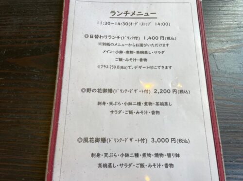 日替わりランチのほか、刺身や天ぷら、煮物などがつく野の花御膳、さらに品数も増える風花御膳があります。
