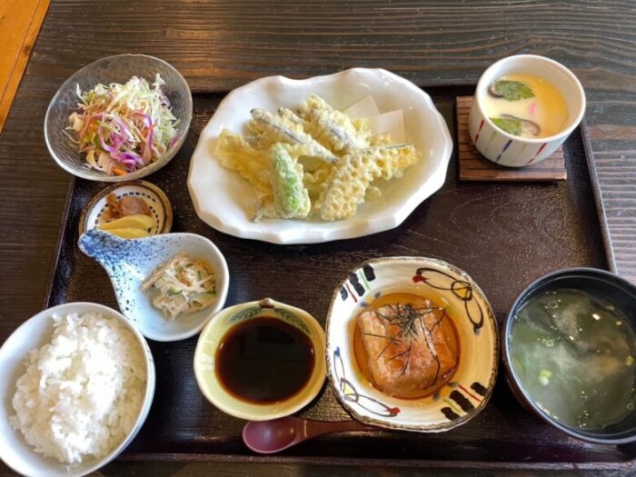 野菜の天ぷらも入ったきびなごの天ぷらに、ご飯、お味噌汁、茶碗蒸し、サラダ、小鉢、お漬物と品数豊富!