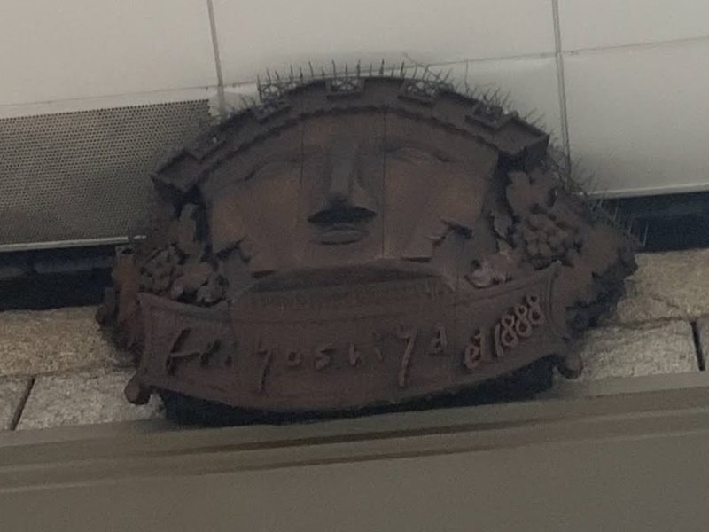 古い資料まで出してもらえました。実はこの顔、約25年前にビルを建て替えた際に、「何か物足りないな」と感じ、親交のあったスペイン在住の芸術家に依頼したもの。