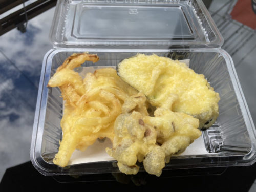玉ねぎ、キノコ、なすの天ぷらはお持ち帰り。