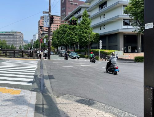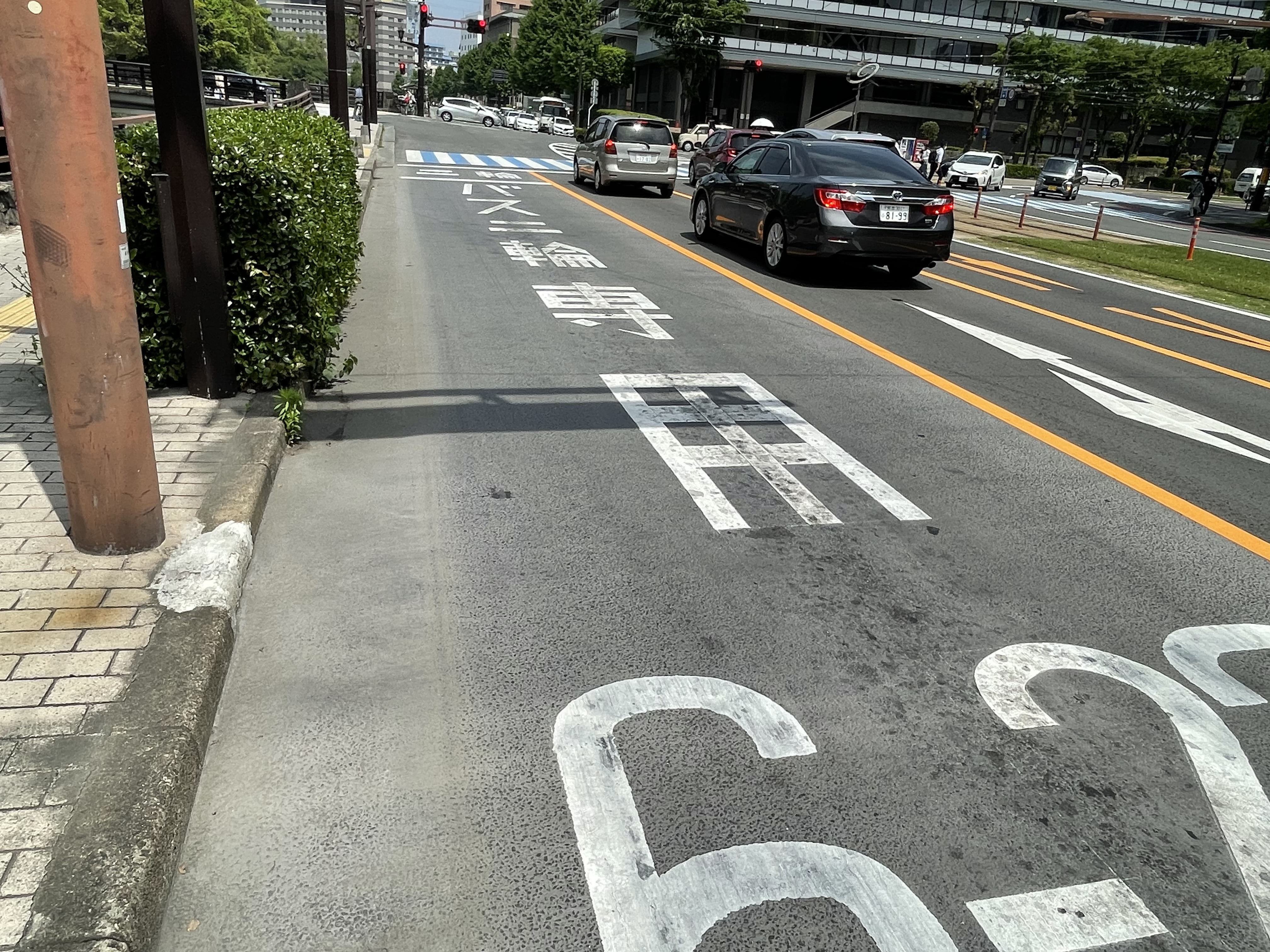 気付いてなかったなんて言わないで!この場所を通行する二輪車は、第一通行帯を通行して「バス・二輪専用信号に従いましょう。