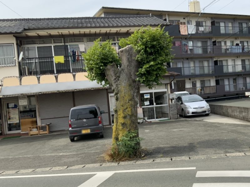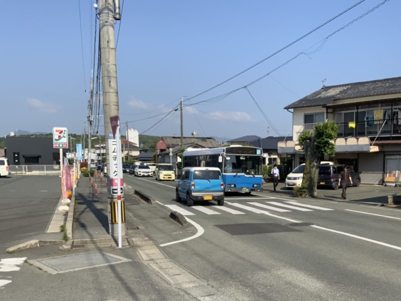 こちらのバス停を管轄している九州産交バスに話を聞いてみると、道幅の都合でバス停が設置できないため、この標識の反対側付近で待っていればバスが停まるそうで、別にあの木がバス停代わりということではないそうです。