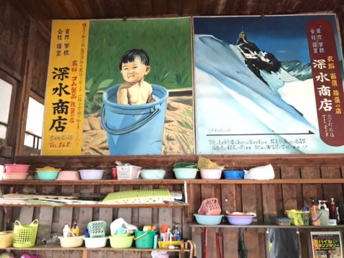 脱衣場の壁には、昭和のままのレトロな看板に、棚には常連さんたちの洗面道具一式。