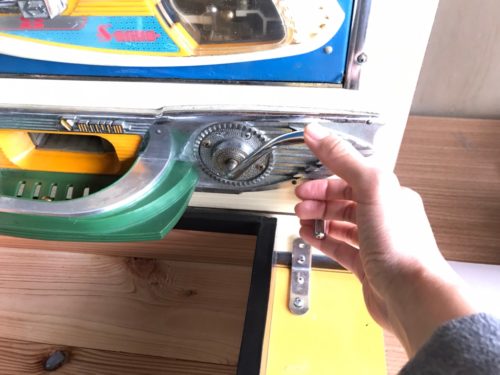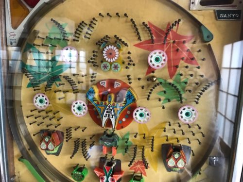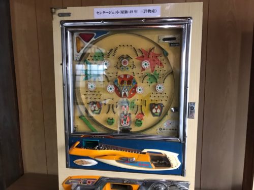 こちらはお客様からの寄贈品で、昭和当時の壊れたパチンコ台の、使える部品だけを寄せ集め、なんとか動くように修復されたという、貴重なもの!