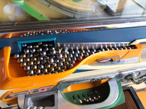 運よく玉がポケットに入ると、「チン!」とトースターのような音がして、玉がじゃらじゃら出てきます。
