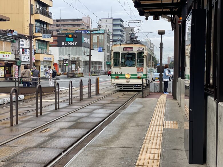 新水前寺駅同様、ホームに降り立ち市電に乗り込むまでの時間から計測しましょう。