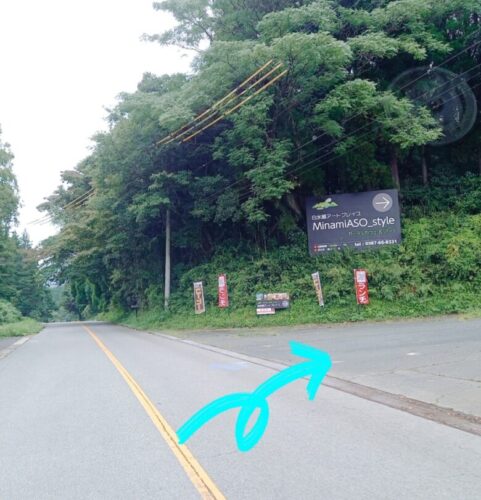 温泉「瑠璃」が見えてきたら左折して阿蘇パノラマラインを上がっていくと看板が見えてきます。