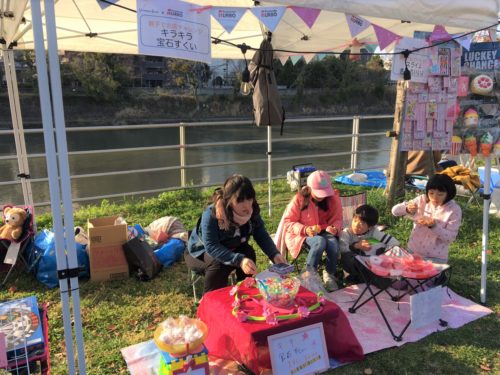 子どもたちの起業家精神育成のために設けられた「親子でお店チャレンジ」のコーナー。キラキラ宝石すくいやヨーヨー釣りなど、子どもたちもお店で頑張っていました。