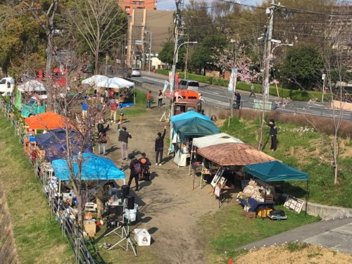 場所は大甲橋下の白川河川敷(東側)。大甲橋から、立ち並ぶテントを見下ろすことができます。