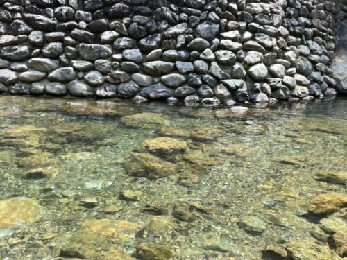 魚が泳いでるのも見える透明で美しい川で、浅瀬は小さな子どもたちでも遊べます。