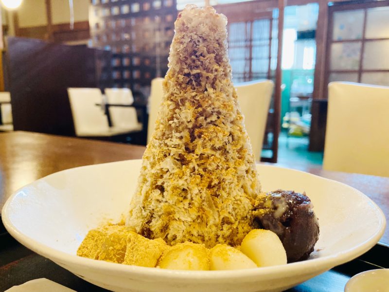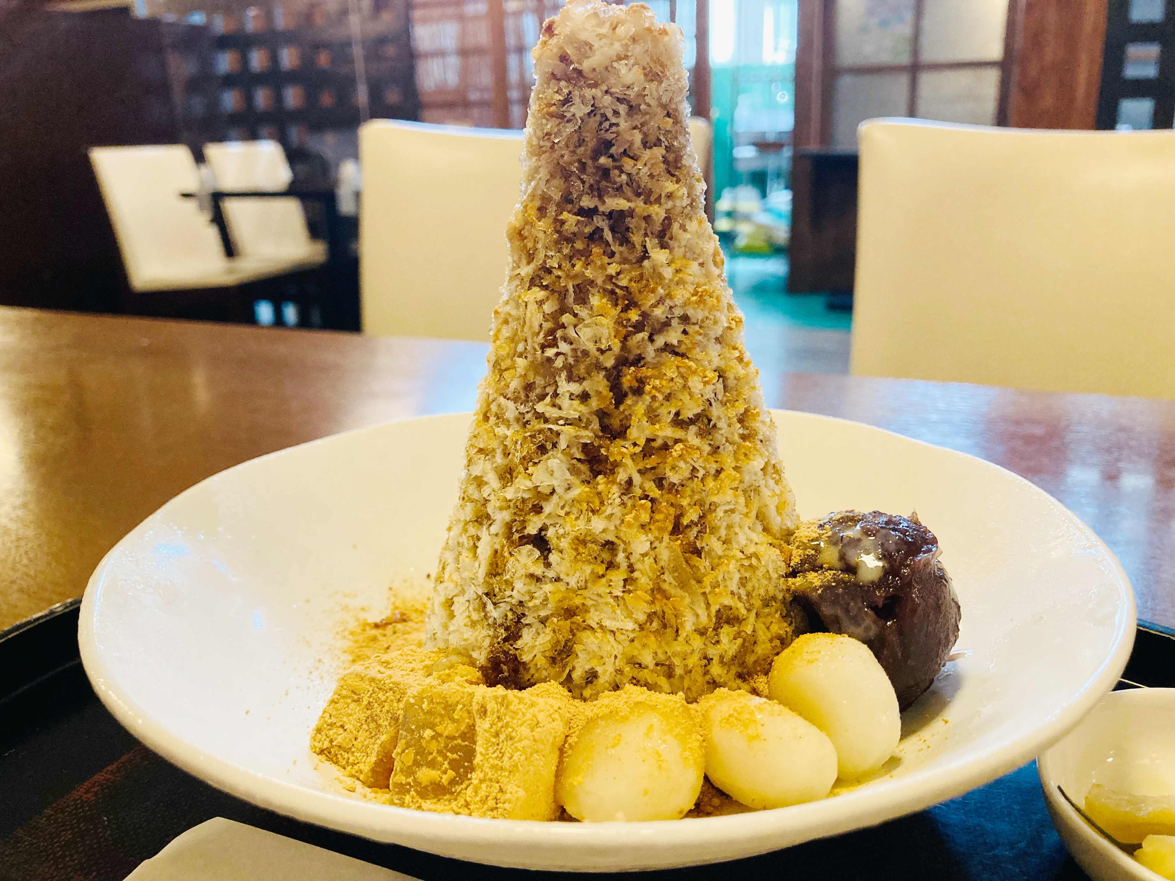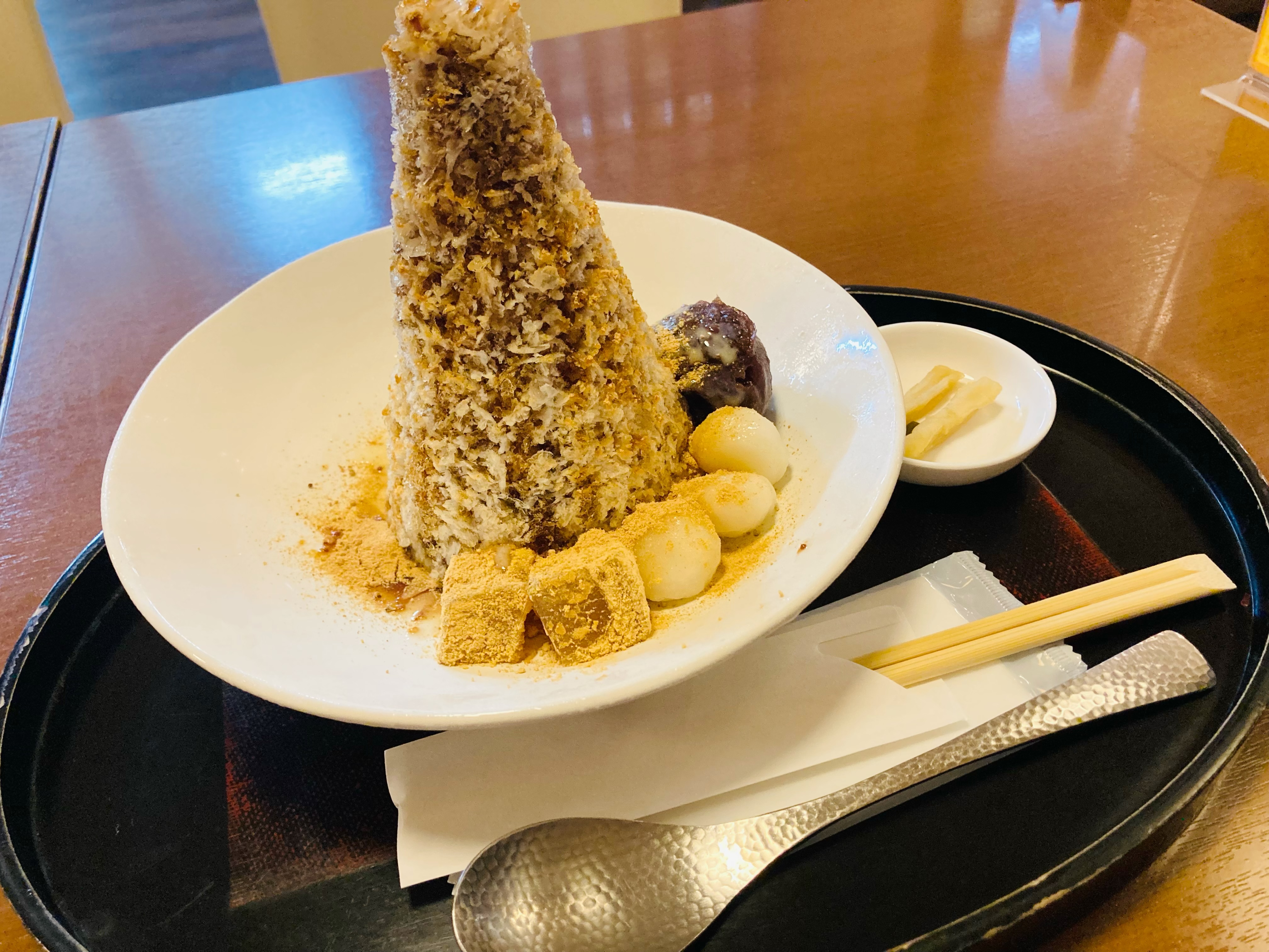 ここの期間限定のかき氷はまるで山!大迫力の見た目なんです。さらに、人気の和スイーツがたっぷり詰まった贅沢なかき氷でした。
