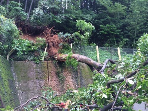 奥にある本殿は、手前にある倒壊した拝殿が偶然にも壁となり、1メートルほどのズレで済んだんだそう。その後、本殿を移動したのですが、そのあとになんと裏山が土砂崩れを起こします。