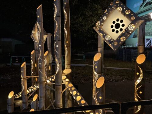 登り坂もあるので、なかなかのいい運動になり、19時過ぎに到着。暗闇にふわっと光る竹あかりが幻想的です。