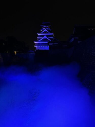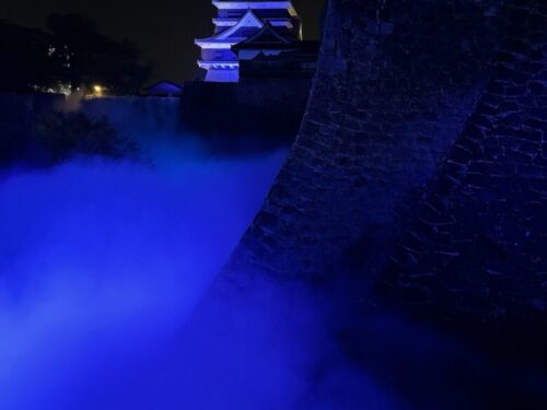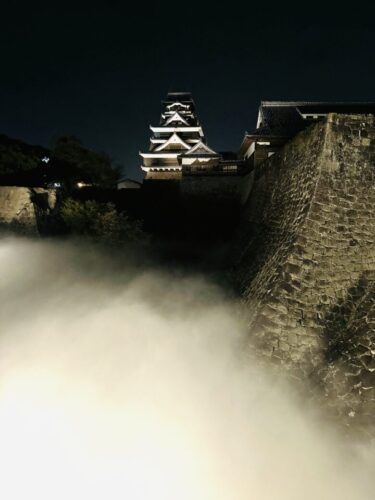 熊本城の古井戸の水を利用したミストで人口雲海も行われております。こちらは午前9時から行われておりますが、夜間18時からは光と音の演出が加わります。