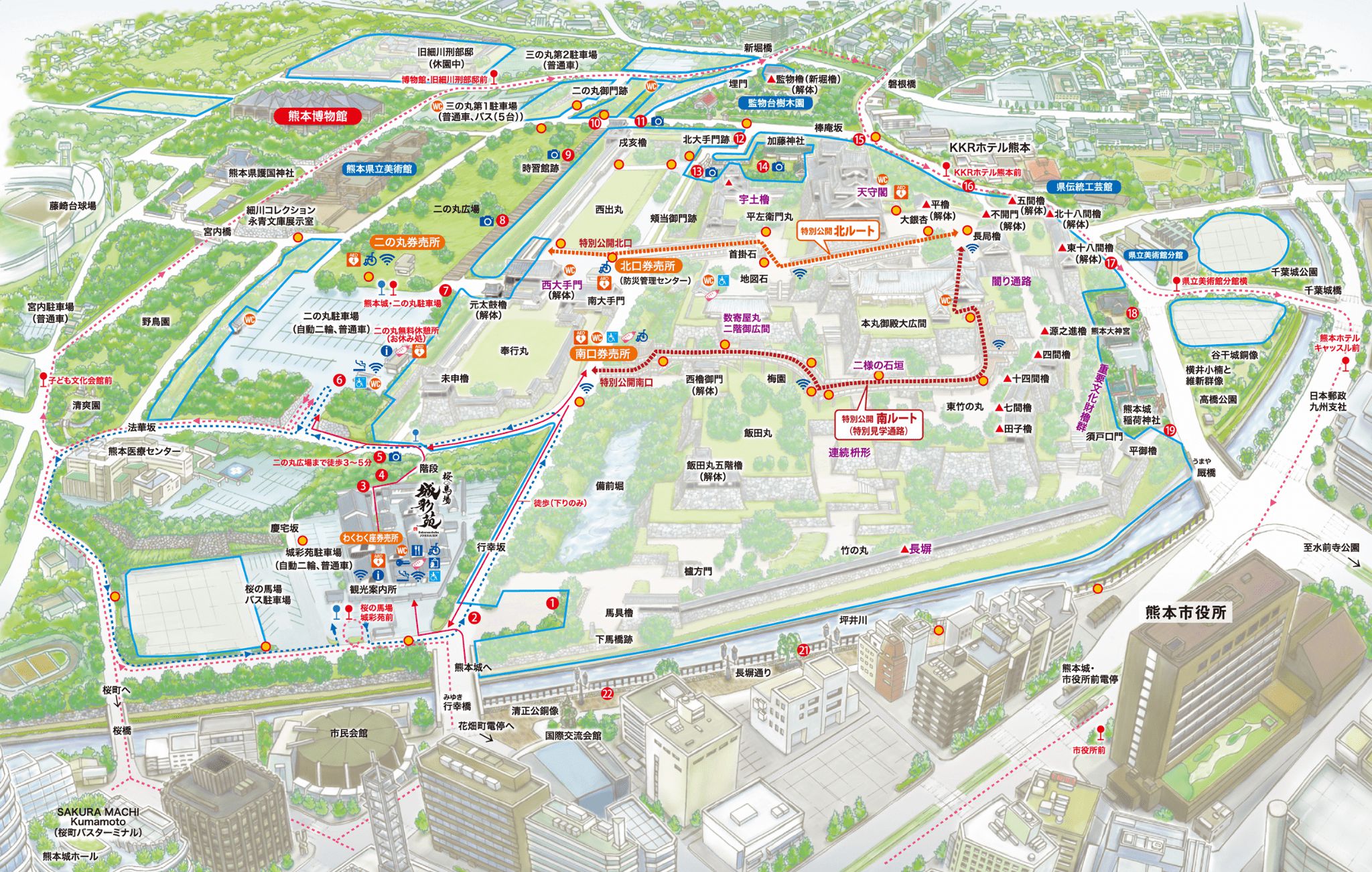二の丸駐車場から最も近い券売所は、二の丸券売所なのですが、せっかくならば空中回廊から回りたいので、城彩苑のほうをぐるっと回って南口券売所から入ってみました。