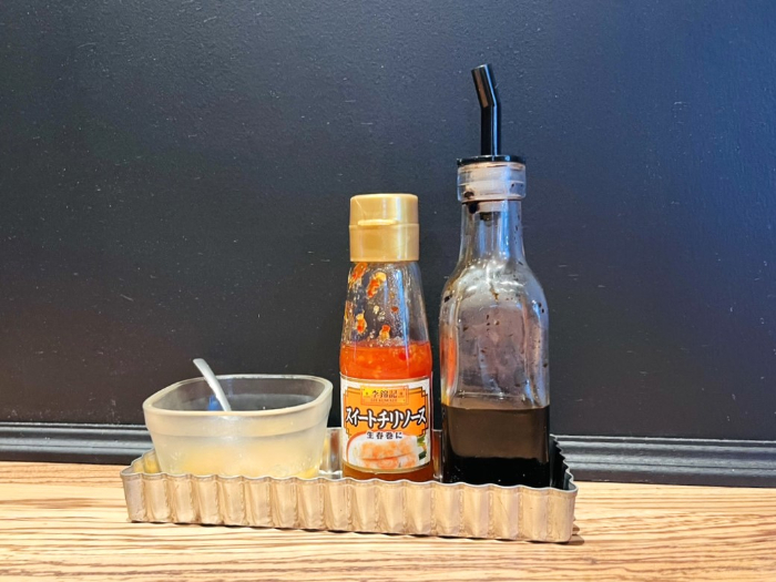 テーブルの上にはジンジャーソース・スイートチリソース・ダークソイソースの3種類が置いてあるので、お好みに合わせて使えます。