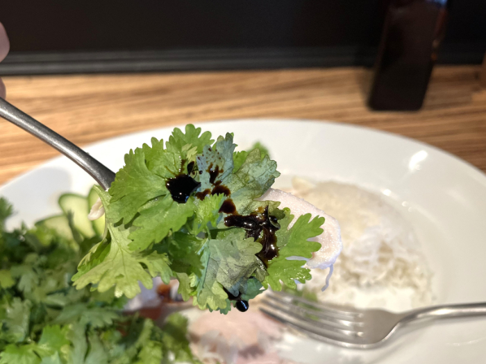 パクチーと一緒に食べることで、あっさりした鶏肉とジャスミンライスが風味豊かに。パクチー好きの方はぜひ追加してみてください!