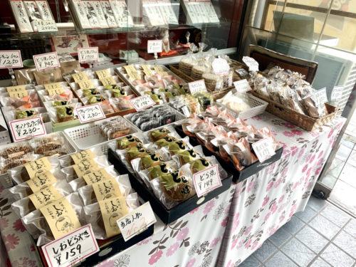 看板商品は「肥後しおがま」(税込120円)という餡入りの落雁のようなお菓子ですが、昔からの商品だけでなく新作もどんどん作られています。店内には新旧の味が並びます。