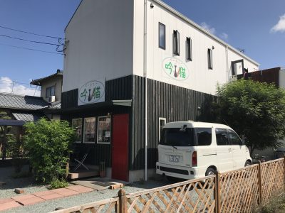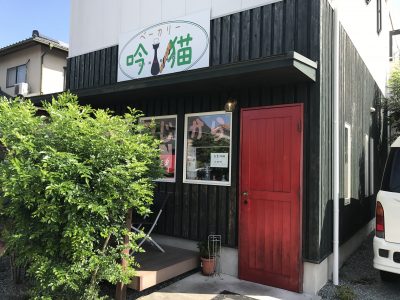 菊陽町にあるベーカリー吟猫。黒い猫の看板と赤いドアが印象的な小さなお店。菊陽バイパス原水、ファミリーマートさん横の歩道橋から左折し、見えてくる黒い猫と緑文字の看板。
