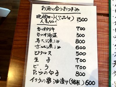 おつまみメニューに「たらの白子」とか「イクラしょうゆ漬け」とかまで!これは美味しそう…