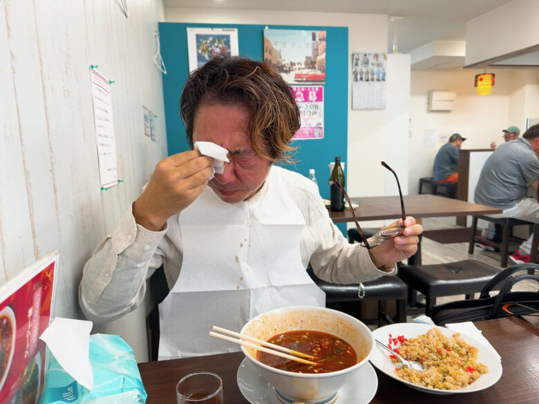 「でもね、これだけは言わせて。辛いだけじゃなくてその先にしっかりと旨味があるの。だから食べ進めちゃってこんなに汗が」