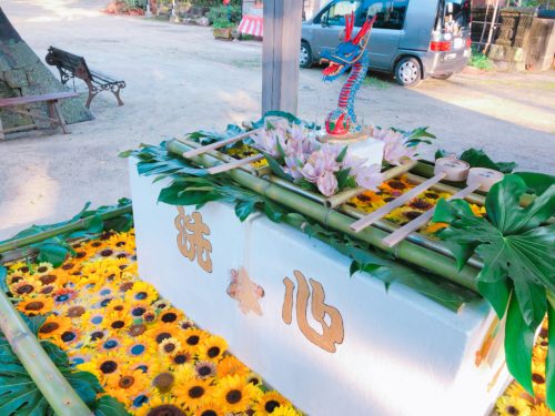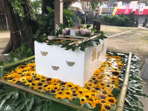 荒尾のお花屋さんの協力もあり、先月の「アジサイ」に続いて、宮司の松田さんのたっての希望で今月は「ひまわり」