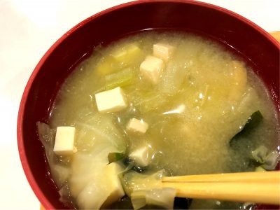 味噌汁の中にも刻んだキャベツが入っており、栄養バランスを考えているように感じました。