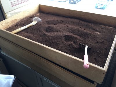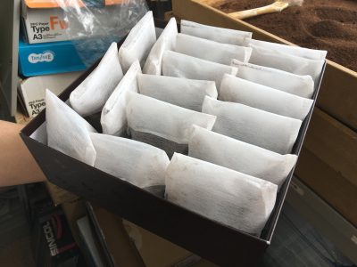 事務所の窓際で天日干しされた珈琲抽出殻をお茶パックに入れたもので、消臭効果が期待できるそうです。