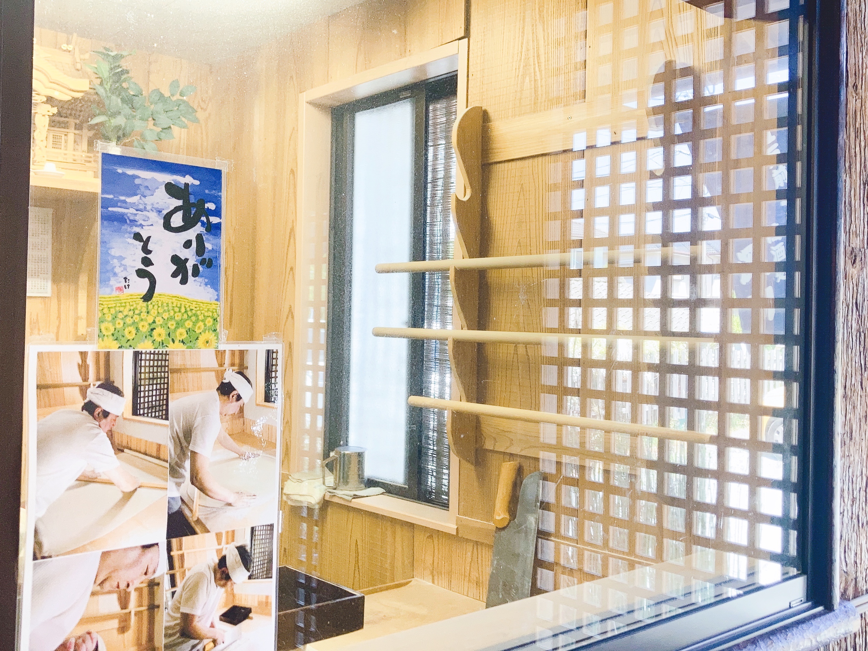お店に入ってすぐ目につくのは蕎麦打ちスペース!お父さんが蕎麦を打っています。運が良ければ蕎麦打ちショーが見られます。