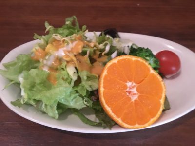 サラダは、焼きナスやブロッコリー、みかんまでのっていて、盛りだくさんです!