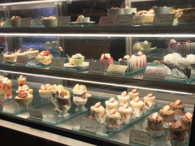 いちごのショートケーキや、フランボワーズ、抹茶のムースなどが並び、見ているだけでわくわく!