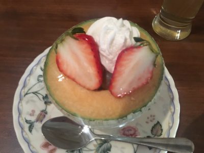赤い果肉のまるごとメロンに生クリームといちご。生クリームの下には、フルーツのゼリー寄せがつまっていて、美味でした!