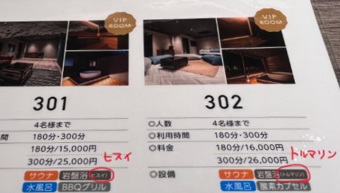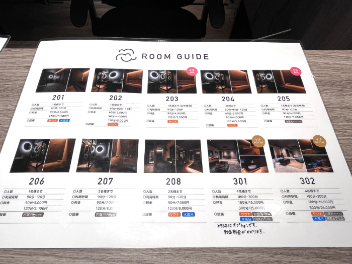 利用できる部屋は全部で10部屋。部屋ごとに利用可能人数が決まっており、1名・2名・4名までの3種類です。2名まで利用できる8部屋はサウナか岩盤浴、4名まで利用できるVIPルームは両方が利用できるそうです。