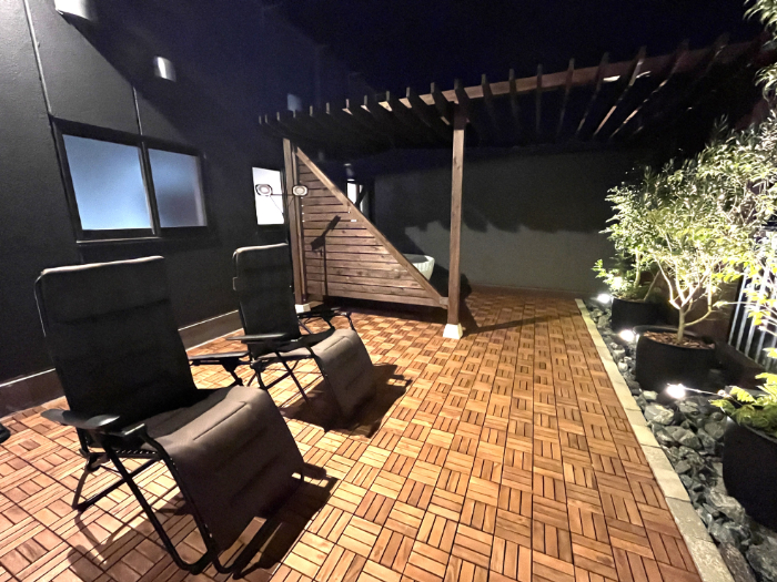 サウナの後には水風呂!そして、テラスにあるチェアでのんびりすることもできます。