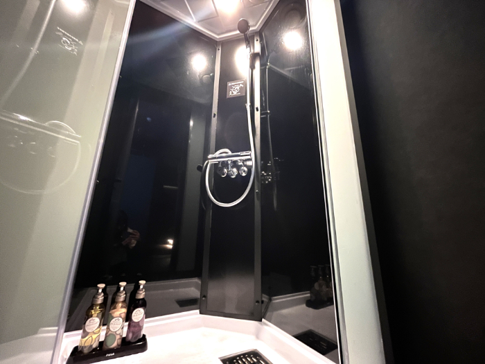 まずはシャワー。ジャンプー、トリートメント、ボディソープもここに設置してあります。