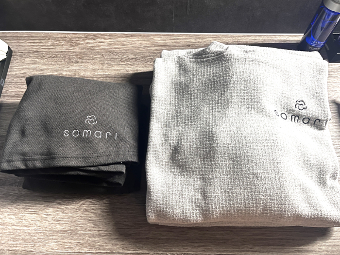 備品も使う可能性があるものは全て揃っています。フェイスタオル4枚、バスタオル2枚、サウナウエア2着、サウナポンチョ2着。