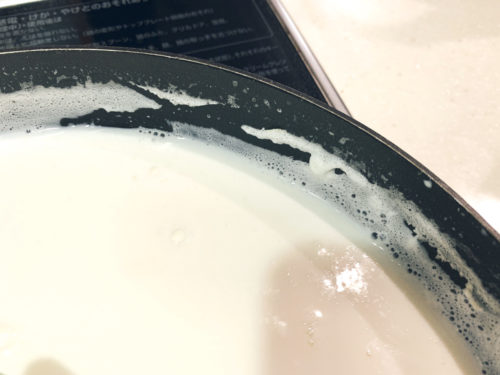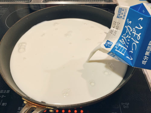 フライパンに牛乳1リットルを注ぎます。鍋よりも表面積の広いフライパンが良いのだそう。